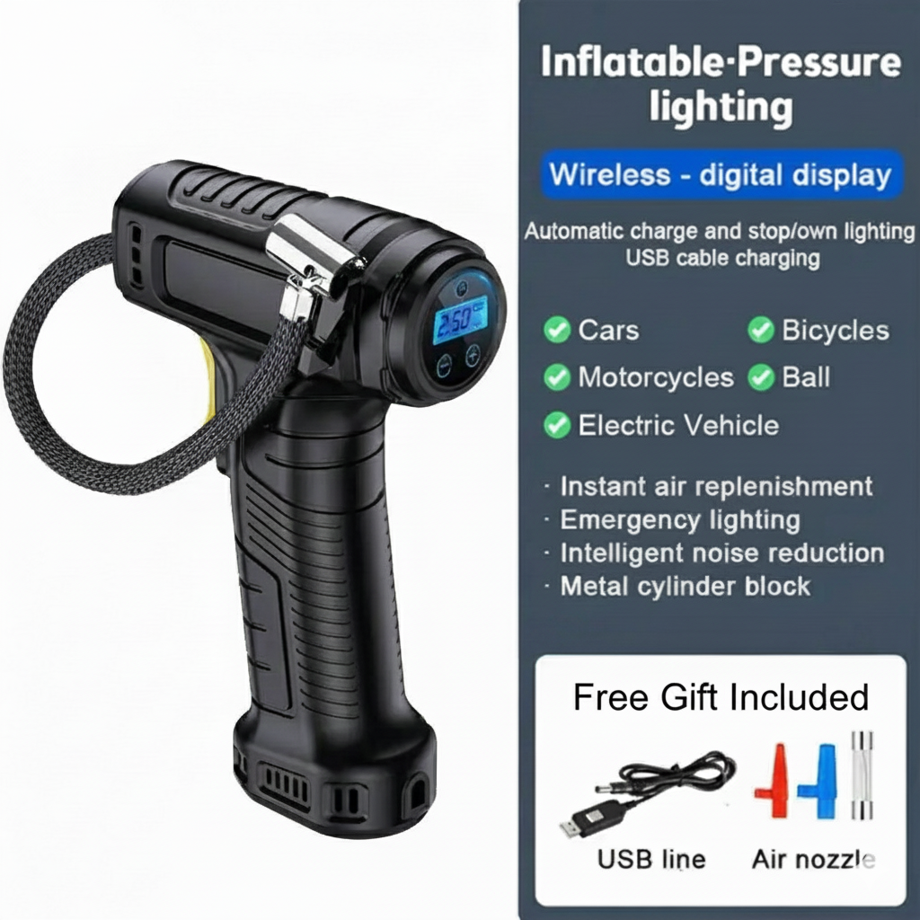You’ll receive the inflator, USB data cable, multiple air nozzle attachments, and everything needed to inflate tires, sports equipment, and inflatables.